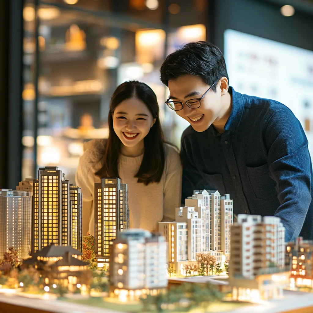 실거주 아파트 vs 투자용 오피스텔 비교를 위해 모델하우스를 보고있는 부부